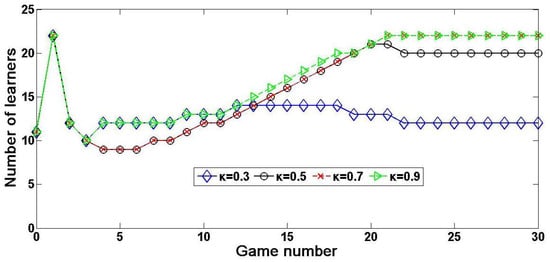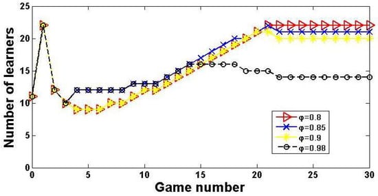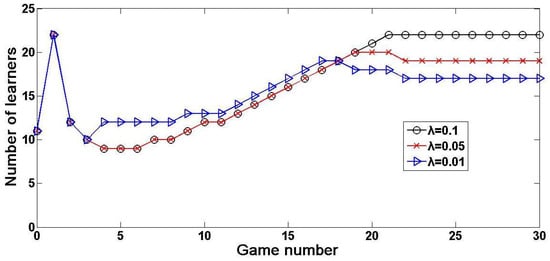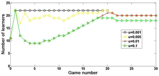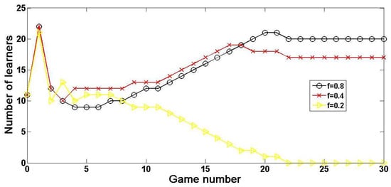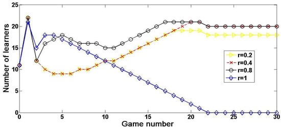 As can be seen, as the amount of rewards r increases, the number of learners continues to increase. When r = 0.2, the number of companies choosing a learning strategy gradually increased from the fourth game, converging to 18 after a short period of shock. When r = 0.4, the number of learners also gradually converges upwards until 20 in the 23rd game. When r is 0.8, the curve is above the first two, indicating that the number of learners is higher, eventually stabilizing at 20. When r is 1, the number of learners decreases rapidly after the first few games, and then decreases to 0 in the 22nd game. It can be seen that when r does not exceed f, the larger the r, the more companies choose the learning strategy. As such, the reward strategies of focal companies promote the learning effect of the entire supply chain network.