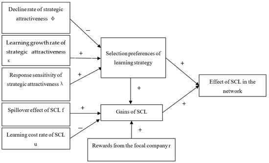 In general, the decline ratio of strategic attractiveness φ, the learning growth ratio of strategic attractiveness κ, the response sensitivity of member companies λ, the spillover effect of SCL f, and the learning cost rate of supply chain network member companies u, and the rewards given by focal companies to supply chain network member companies r are all factors which affect SCL. Based on the above discussion, the dynamics inherent to SCL are captured in Figure 11.
