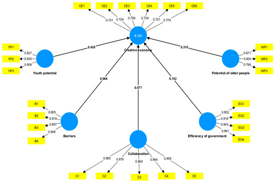 Path coefficients of variables of “Youth potential” and “Creative economy”, “Potential of the elderly” and “Creative economy”, “Efficiency of public administration” and “Creative economy”. Source: Compiled by the authors based on the analysis in the Smart PLS 3 program.