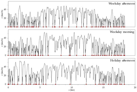 Figure 4. Passenger loading and unloading stops are indicated by red dots, while the remaining zero velocity points are due to traffic lights or traffic delays primarily caused by queues to access roundabouts. Additionally,