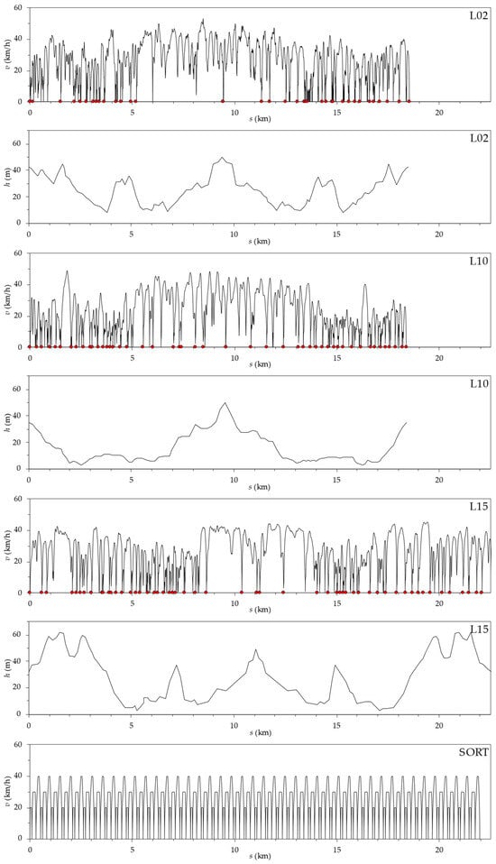 The real velocity profile does not exceed 50 km/h in any case. It is also observed that the central sections of all lines have a lower number of stops. These sections correspond to the portion of the route carried out in the eastern periphery, near the hospital. Additionally, line L15 has a zone with fewer stops at the beginning and the end of the route, corresponding to the connection between the southern periphery and the city. In peripheral areas, the number of traffic lights and roundabouts is lower, and the probability of stopping at a passenger stop is also reduced. Therefore, despite the three lines having a similar number of potential boarding stops (approximately 60 each), the effective number of stops per distance traveled is much lower in L02, in line with the SORT 1 value. This is because almost half of the route corresponds to the eastern periphery. The number of stops per distance traveled for L15 is lower than for L10 due to the trajectory through the southern periphery at the beginning and end of each journey.