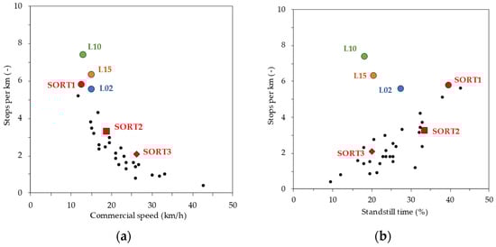 18]. The commercial speeds of L02, L10, and L15 are in the lower range, comparable to SORT 1, but slightly higher than expected when considering the stops per km. This is due in part to the comparatively short duration of stops as can be seen in