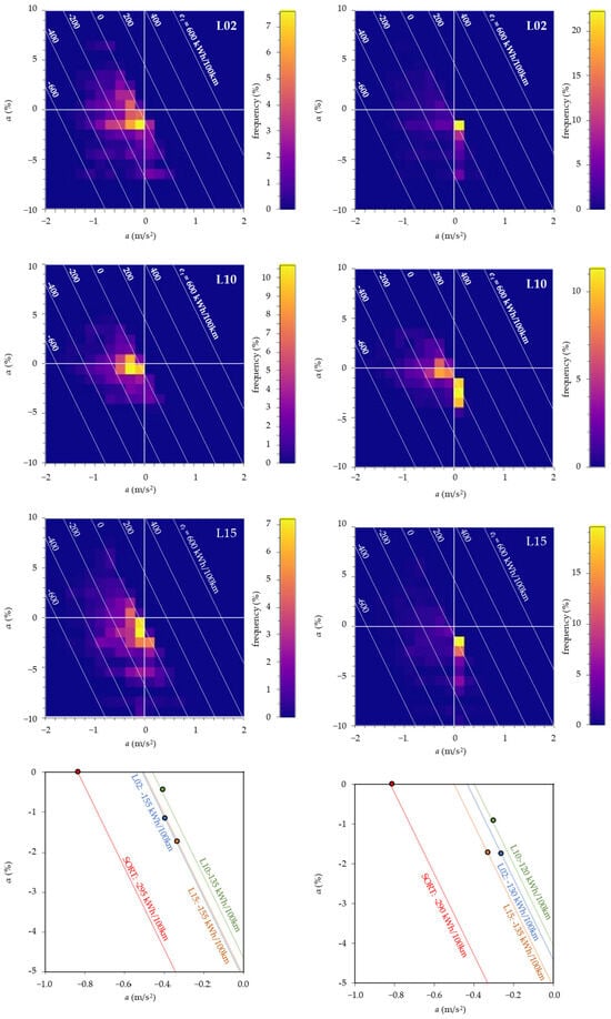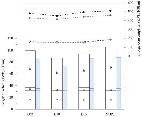 Figure 7 demonstrates how the cycle characteristics determine the required braking energy and, consequently, the energy demand. In comparative terms, the L10 route involves lower accelerations and gradients than lines L02 and L15. Additionally, line L02 frequently experiences higher accelerations but lower gradients than L15. As a result, L10 will have lower braking than lines L02 and L15. This is further highlighted in the summary graph, which shows, for each cycle, the overall specific braking energy. It is observed that, indeed, the braking energy of lines L02 and L15 is higher than that of L10 (≈145 vs. 135 kWh/100 km). When comparing lines L02 and L15, a higher or lower acceleration is compensated by a lower or higher gradient, respectively. Consequently, braking energy is similar in both lines. Finally, it is noted that SORT 1 dissipates more energy due to braking (295 kWh/100 km) than the real cycles. Despite not considering road gradients, the deceleration during braking exceeds 0.8 m/s