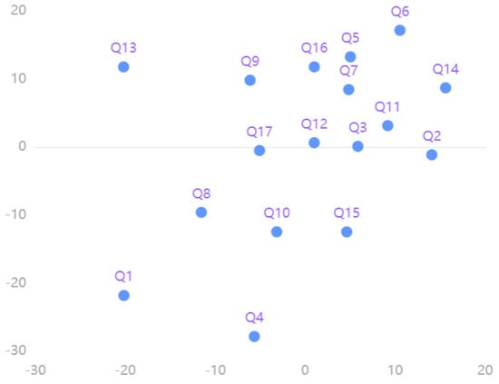 In order to further explore the correlation between problems, this study was then factor analyzed using structural equation modeling. Prior to this, this study used multidimensional scaling analysis to obtain the distance matrix (in Table S2) between each problem, reflecting the degree of difference between the problems. The spatial perception map obtained by the analysis is shown in Figure 2.