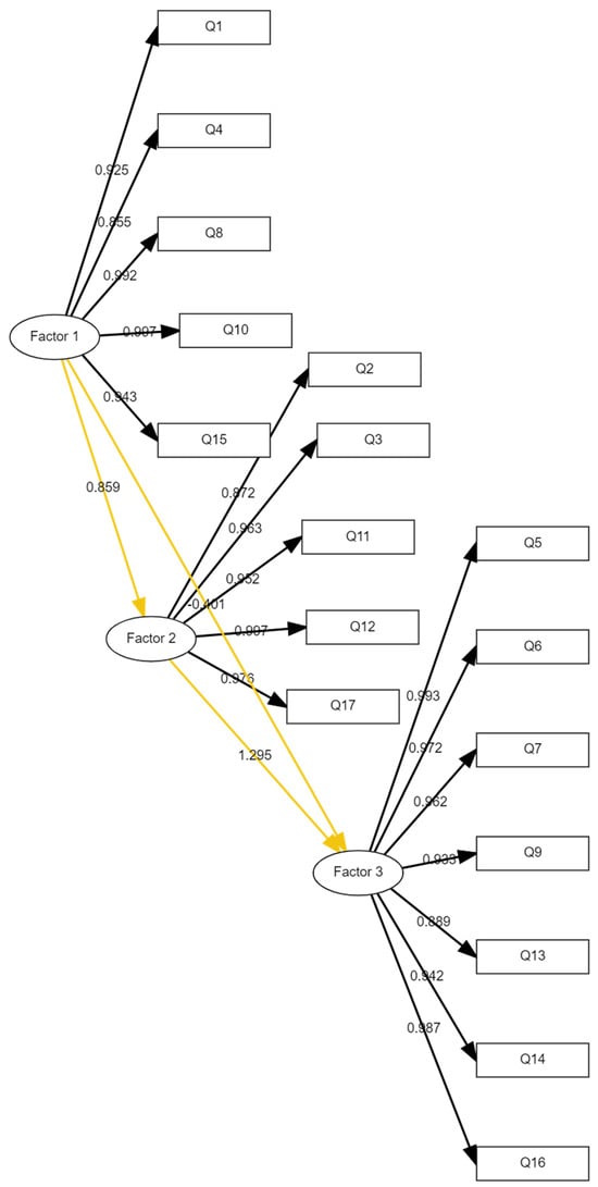 Combining Table S2 and Figure 2, this study divided factors according to the vertical dimension and determined that Q1, Q4, Q8, Q10, and Q15 are factor 1; Q17, Q12, Q3, Q11, and Q2 are factor 2; and Q13, Q9, Q16, Q5, Q7, Q6, and Q14 are factor 3. After bringing these factors into the structural equation model (SEM), the results are shown in Figure 3 and Table 3.