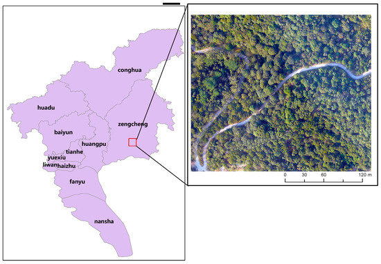 The study area of this paper is located in the Zengcheng District Forestry Farm (23.292°–23.369° N, 113.681°–113.815° E), Guangzhou City, Guangdong Province, which is a state-owned forest farm with a total area of about 2777.55 hm2. This area is located in the eastern part of Guangzhou City and has a subtropical oceanic monsoon climate, with an average annual temperature of about 22.1 °C, making it warm and rainy, with long summers and short winters. The average annual rainfall is 2039.5 mm, the average annual relative humidity is 78.8%, and the annual sunshine is 1715.4 h. This natural condition is very suitable for tree growth, so there are many kinds of trees and rich vegetation in the forest, with tree species mainly including Masson pine (Pinus massoniana), Eucalyptus (Eucalyptus robusta Smith), Camphor (Cinnamomum camphora (L.) Presl), Fir (China fir), etc. The area of plantation in the forest is large. Due to this large forest plantation area and the wide distribution of different tree species, this study selected part of the area for the carbon stock study that covers an area of 6.83 hm2. The geographical location of the study area is shown in Figure 1.