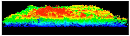 In this study, the data preprocessing mainly includes two parts: point cloud data denoising and point cloud data normalization. The LiDAR scanning process is easily affected by various factors, resulting in some non-negligible noise in the point cloud data, which affects the effectiveness of detection [21]. In this study, the neighborhood determination method is used to remove the noise points, the threshold for the number of field points is set to 10, and the distance threshold is set to 5 times the standard deviation of the mean elevation of the point cloud [22]. In this study, we use the elevation value of the point cloud data to subtract the corresponding DEM elevation value to achieve the normalization process, as shown in Figure 2.