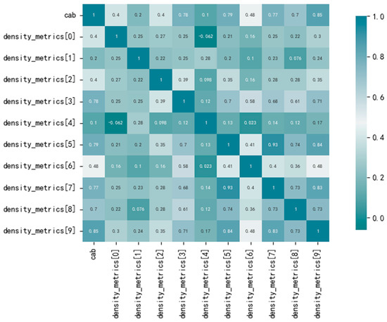 In this study, the point cloud feature variables that were selected using the SCC method and the XGBoost algorithm and all the variables extracted based on the airborne LiDAR data were used as the explanatory variables, and the carbon stocks that were calculated based on the biomass and carbon content coefficients were used as the response variables, in order to construct a model for carbon stock estimation. Figure 3 shows the correlation between forest carbon stocks and LiDAR height statistical variables using the SCC variable screening method, Figure 4 shows the correlation between carbon stocks and LiDAR density statistical variables using the SCC variable screening method.