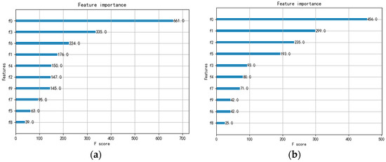 In this study, the “model.feature_importances” function is utilized to score the feature importance (F score) of all the above LiDAR point cloud feature variables. The left side of the figure is labeled to correspond to the above extracted variables one by one in order, and the results are shown in Figure 5.