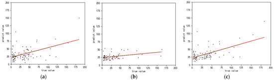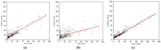 Schematic diagram of the fitting effect of the test set of the XGBoost algorithm. (a) Testing effect of the Bagging method; (b) testing effect of the KNN method; (c) testing effect of the Random Forest method.