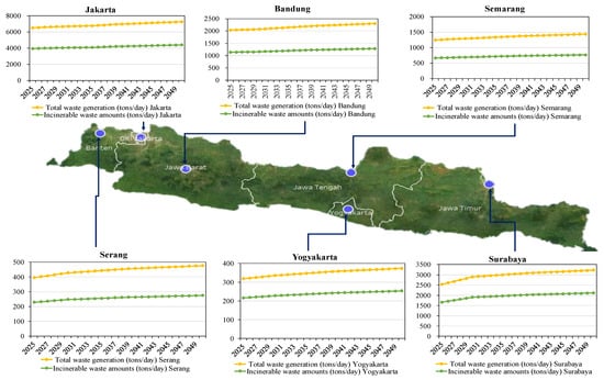 Java Island is Indonesia’s most densely populated and developed region, emerging as the country’s growth engine. It is composed of six provinces. The total population of Java Island reached 151.65 million by 2020, accounting for 56.1% of Indonesia’s population []. The rapid urbanization in these cities has led to increased waste generation, straining the existing waste management infrastructure. The MSW generation of Java Island was 33.32 Mt in 2022, accounting for 59.7% of Indonesia’s total MSW. The composition of the MSW among the six capital cities in Java Island varies significantly, but is dominated by food waste, garden waste, and plastic and paper waste (Table S1 in Supplementary Materials). Moreover, Java Island accounts for 80% of Indonesia’s total energy consumption. Therefore, Java Island is a typical case to study how to respond to both challenges of MSW management and renewable energy solutions in Indonesia. Six capital cities of the provinces in Java Island are selected as representatives for comparison. The specific locations of the six capital cities in Java Island and a satellite image with additional features of estimated waste generation from 2025 to 2050 considering Jakstranas policy are displayed in Figure 1.