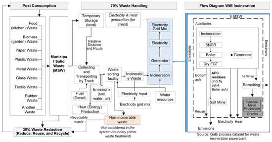 The goal of this study is to evaluate the life cycle environmental impact of WtE incineration in Java Island, Indonesia. The widely used LCA tool GaBi for environmental impact assessment is used to evaluate WtE incineration in this study. The year 2025 is selected as the effective year upon the implementation of Indonesia’s MSW policy, namely, Jakstranas (stipulated in Presidential Regulation No. 97/2017). The waste categories for incineration consist of food (kitchen), biomass (garden), paper, plastic, textile/fabric, and rubber/leather materials [,,]. The system boundary of MSW incineration in Java is gate-to-grave (Figure 2), including the stages of storage, collecting and transporting, sorting, and incinerating the incinerable MSW. Since an incineration plant still does not exist in Java, we used the modeled incineration plant process database embedded in the LCA software GaBi ver. 9.5.2 as an input for the incineration module. The system boundary of the incineration module is shown in the right side of Figure 2. The modeled incineration plant is defined based on the treatment of average municipal solid waste (MSW) in Europe, which is likely to be introduced to Indonesia. The dataset covers all relevant process steps for the thermal treatment and corresponding processes, such as the disposal of air pollution control residues or metal recycling. For example, technologies of dry flue gas cleaning and selective non-catalytic reduction (SNCR) for NOx-removal to meet the legal requirements are adopted. For further detail about the incineration technology and system boundary, you can refer to http://gabi-documentation-2019.gabi-software.com/xml-data/processes/aa364db3-52ce-4bee-89eb-b86426753ec2.xml (Accessed on 6 August 2021). The functional unit in this LCA study is defined as the daily total incinerable waste incinerated.