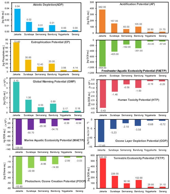 Figure 3 shows the daily potential life cycle environmental impacts from 100% MSW incineration by 2025 in each capital city of Java. It has been found that the environmental impacts contributed by WtE in Jakarta are the largest, followed by Surabaya, Bandung, Semarang, Serang, and Yogyakarta. At least two cities share almost similar values in environmental impact, with merely negligible disparity. Moreover, in Java’s percentage of total environmental impact values, we show that Jakarta shares 51% of AP and EP impact indicators and holds 50% contribution for ADP, GWP100, MAETP, HTP, ODP, POCP, and TETP impact indicators. Jakarta shares around 49% of the FAETP indicator. The main reason for this is that Jakarta has the highest MSW generation quantity, which leads to enormous incinerable MSW resources for WtE incineration input. Concerning other cities, Surabaya holds a 21% share for all impact indicators in Java, except for the FAETP impact indicator, which denotes 22%. Semarang has contributed 9% of the environmental impact in ADP, GWP100, POCP, and TETP, while it also contributes 8% in AP, EP, FAETP, and HTP, and 7% in ODP. Bandung city accounts for 14% of all impact indicators, except in FAETP and HTP, which are 15%. Additionally, both Serang and Yogyakarta cities have a similar fraction (approximately 3%) for all of the impact indicators in the Java region. The reason that both Serang and Yogyakarta municipalities share an equal impact on the environment is because their MSW quantity generated is also quite similar. Essentially, all of the environmental impact indicators in Java Island are interrelated with MSW generation; therefore, the more incinerable waste available, the higher the impact value from the combustion of incinerable waste.