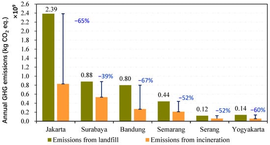 Figure 4 presents a comparative analysis of GHG emission reduction potential, where incineration is implemented to replace landfill in 2025. By shifting from landfill disposal to WtE incineration, the annual GHG emissions from MSW treatment in Java can be reduced by 56% on average. From the perspective of regional disparity, we depicted that Bandung holds the highest GHG reduction potential, accounting for 67%, followed by Jakarta (64%), Yogyakarta (60%), Semarang (52%), Serang (52%), and Surabaya (39%), respectively. The reason for this is that the absolute reduction potential is closely related to the MSW amounts of different cities, with high MSW generation regions having the highest GHG reduction potentials. While the reason behind the relative reduction potential results is that it is affected by many parameters (as shown in Tables S8 and S9), such as half-life time, methane generation rate, and diesel consumption in landfill. By quantity average, the landfill system in our study generated 1094 kg CO2 eq./tonne, which is relevant and comparable with other studies, such as 1000 kg CO2 eq./tonne [], 900 kg CO2 eq./tonne [], and 668 kg CO2 eq./tonne []. Whereas the incineration system of this study generated 432.37 kg CO2 eq./tonne of incinerated waste on average. In another study, the emissions from incineration ranged from 250 to 600 kg CO2 eq./tonne [], 646 kg CO2 eq./tonne [], and 331 kg CO2 eq./tonne [].