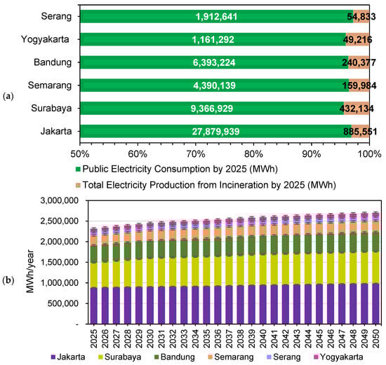 Figure 5 shows the energy potential from employing 100% incineration of incinerable waste. It can be seen from Figure 5a that the incineration power plant in Jakarta produced the highest amount of electricity in 2025, with approximately 885,551 MWh/year, followed by Surabaya (432,134 MWh/year), Bandung (240,377 MWh/year), Semarang (159,984 MWh/year), Serang (54,833 MWh/year), and Yogyakarta (49,216 MWh/year), respectively. It is forecasted that the electricity generation potential of the six capital cities will generate electricity with an increasing trend from 2025 to 2050. The total electricity generation from incineration in Java Island is estimated to reach 2,316,523 MWh/year in 2025, and 2,704,036 MWh/year in 2050 (Figure 5b). Considering the waste produced and electricity generated, the results imply that the higher the population size in a particular location, the more incinerable waste is obtained, and the greater the potential electricity produced from the incineration. Furthermore, the amount of electricity generated compared to the regional public electricity consumption denotes the electricity share contributions. It has been found that the city with the highest electricity contribution share is Surabaya (4.61%), followed by Yogyakarta (4.24%), Bandung (3.76%), Semarang (3.64%), Jakarta (3.18%), and Serang (2.87%), sequentially. On average, the contribution of electricity from incineration to public energy consumption is 3.72%. Indonesia sets its energy targets for renewable energy as 23% of the primary energy grid mix by 2025. Therefore, incineration electricity can contribute to approximately 16% of the renewable energy target.