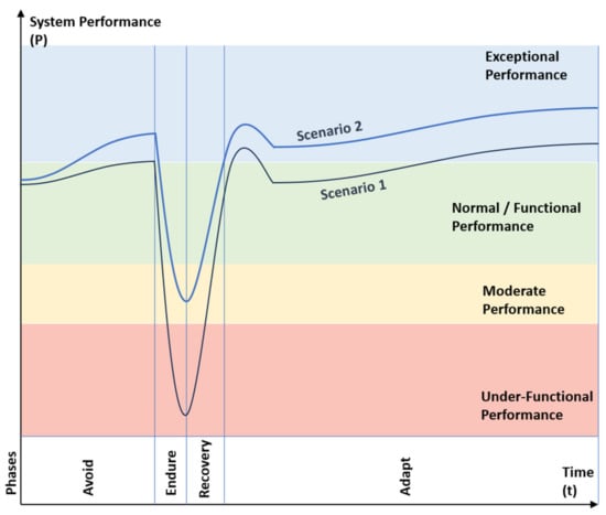 Resilience stages and demonstrative scenarios of system performance in the face of disruptive events.