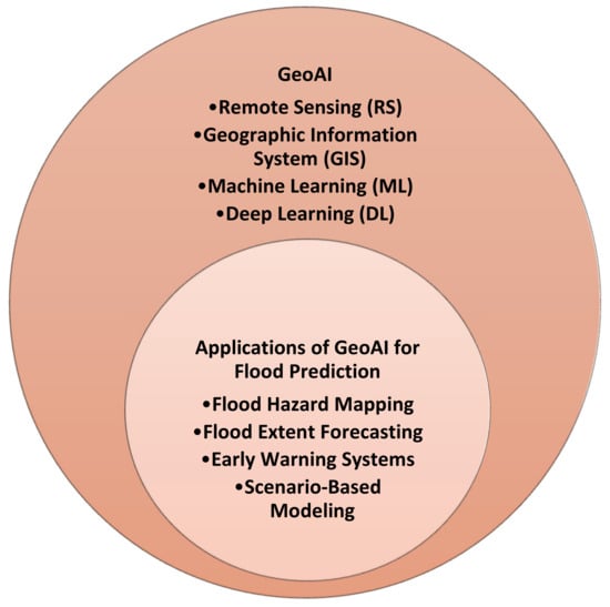 The core GeoAI technologies and data sources correspond to (i) Remote Sensing—satellite imagery (optical and radar) provides data on land cover, terrain elevation, soil moisture, and precipitation patterns, feeding into hydrological modeling; (ii) Geographic Information Systems (GISs)—GISs layer on historical flood data, infrastructure locations, population density, and other variables, allowing for vulnerability and risk assessment; (iii) Machine Learning (ML)—algorithms such as Support Vector Machines (SVMs), Random Forests, and Artificial Neural Networks (ANNs) can learn patterns from complex, multi-source data to predict flood occurrences and spatial extents; and (iv) Deep Learning (DL)—Convolutional Neural Networks (CNNs) and Recurrent Neural Networks (RNNs) excel at handling big data, uncovering subtle spatial–temporal relationships, and improving real-time predictions [67,68].