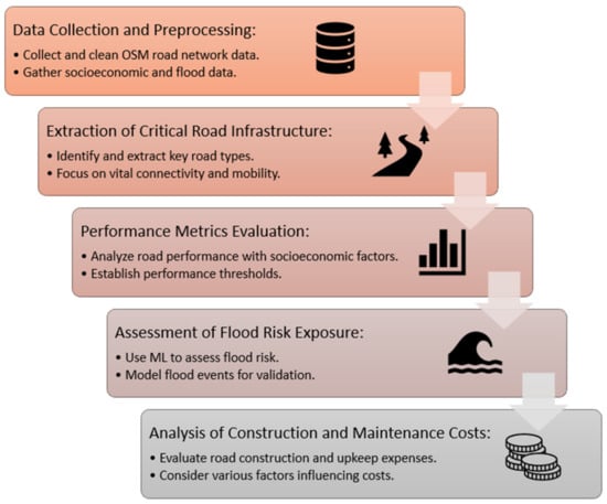 By systematically following this framework methodology, the study aims to provide comprehensive insights into road infrastructure management, addressing critical issues related to performance evaluation, flood risk mitigation, cost optimization, and resilience enhancement.