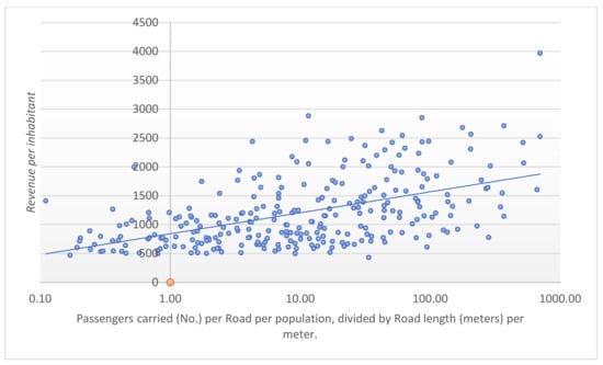 The scatter plot in Figure 4 provides insights into the relationship between transportation efficiency, population density, and municipal revenue per inhabitant across Portuguese municipalities. The observed distribution suggests that municipalities with higher levels of transportation efficiency, as indicated by the ratio of passengers carried by road per unit population to road length per unit area, tend to have higher levels of municipal revenue per inhabitant. This implies that more efficient road transportation infrastructure is associated with a greater financial performance and resource utilization efficiency of local governments. The scatter plot also demonstrates the variability in this relationship, with some municipalities exhibiting a higher transportation efficiency, but a lower municipal revenue per inhabitant, and vice versa. This suggests that other factors, such as socioeconomic characteristics, investment patterns, and governance structures, may also play a significant role in determining the overall financial performance of local governments.