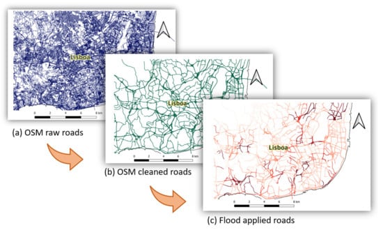 According to Ginkel et al. in Natural Hazards and Earth System Sciences [1], the European road networks face an estimated annual direct damage of approximately EUR 230 million from large river floods, with additional economic losses and emergency repair costs [1,2]. The pervasive impact of flooding poses a significant challenge to transportation networks worldwide [3]. Climate change and urban expansion exacerbate this challenge, resulting in infrastructure strain, road closures, traffic congestion, community isolation, and substantial economic ramifications [4]. Enhancing the resilience of road networks is imperative for societal well-being and economic stability in the face of escalating flood risks [5,6,7].