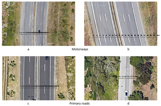 Scaled satellite view of Motorway (a,b) and Primary roads (c,d).