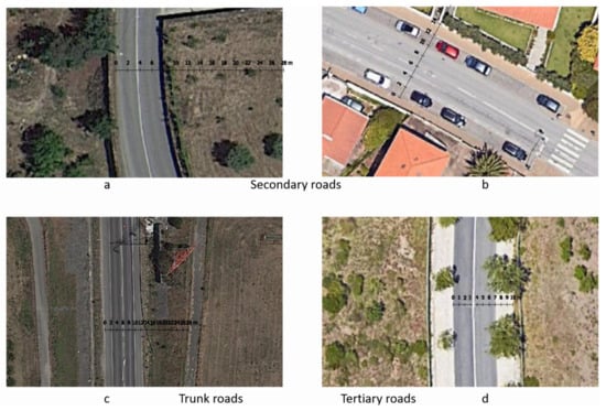 Scaled satellite view of Secondary roads (a,b), Trunk roads (c), and Tertiary roads (d).