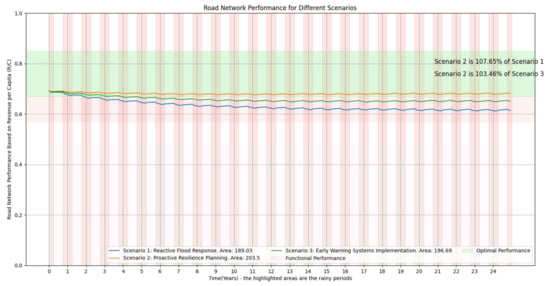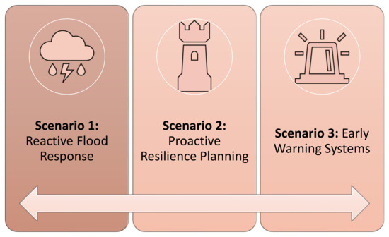 Finally, in the sixth stage (Scenarios: Sensitivity Analysis and Robustness Evaluation), (i) multiple scenarios are defined, to assess the sensitivity and robustness of resilience strategies for road networks under varying conditions. These scenarios include reactive flood response, proactive resilience planning, implementation of early warning systems [77], multi-stakeholder collaboration, and adaptive management strategies; and (ii) sensitivity analysis involves evaluating the impact of key parameters and assumptions on outcomes, while robustness evaluation assesses the effectiveness and reliability of resilience strategies against uncertainties and disruptions. Insights gained from scenario analysis inform decision-making processes, aimed at enhancing road network resilience and promoting sustainable development.
