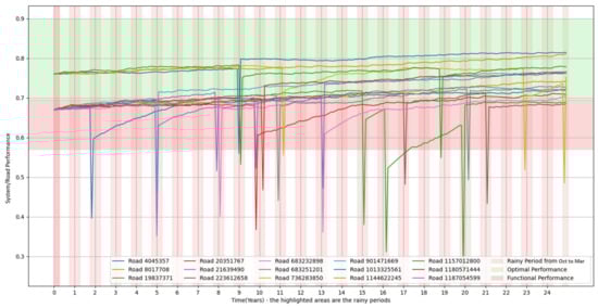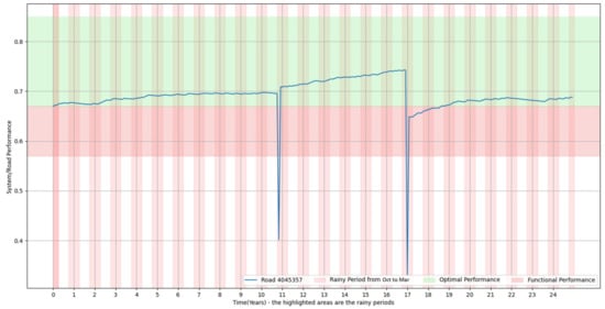 The key asset types and their performance aspects correspond to (i) Pavements—flexible (asphalt) and rigid (concrete) pavements must resist factors like traffic loads, thermal expansion, and moisture penetration [45]. Key performance measures include cracking resistance, smoothness, deflection, and skid resistance; (ii) Bridges—performance measures focus on structural health, deflection under load, corrosion resistance, and seismic resilience. Regular inspection and condition rating systems are vital for assessing bridge performance over time; (iii) Drainage Systems—culverts, pipes, and ditches play a critical role in preventing road inundation. Capacity, blockage avoidance, and resistance to scour are essential performance characteristics [46,47]; and (iv) Traffic Management Systems—signals, variable message signs, and other intelligent systems rely on technical reliability, energy efficiency, and the ability to manage traffic flows under changing conditions.