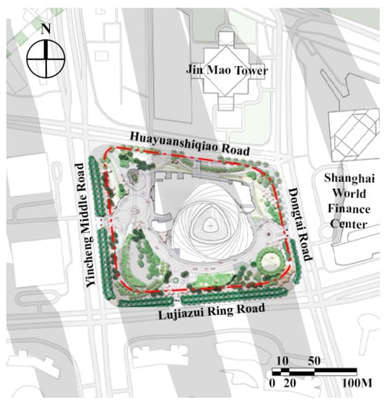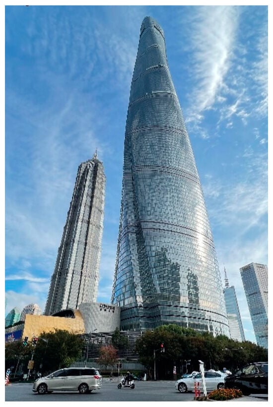 The Shanghai Tower is the tallest building in Shanghai, situated amidst the high-rises of the Lujiazui Financial Center. It occupies a total area of 433,954 square meters. With five basement floors, the tower rises to 128 floors, reaching a height of 632 m with a structural height of 580 m [17]. Vertically divided into nine zones, each zone features an atrium at its basement level. The floors serve various functions, including commercial complexes, offices, hotels, and observation decks. The construction took 9.5 years to complete and launched on 27 April 2016 [18] (Figure 1 and Figure 2). Its versatile design serves various functions, including offices, hotels, observation decks, and retail spaces. The tower’s structural integrity is fortified through a sophisticated system comprising a mega-frame core, exterior enclosure structure, and diagonal trusses, meticulously designed to maximize resistance against horizontal loads such as wind and seismic forces.