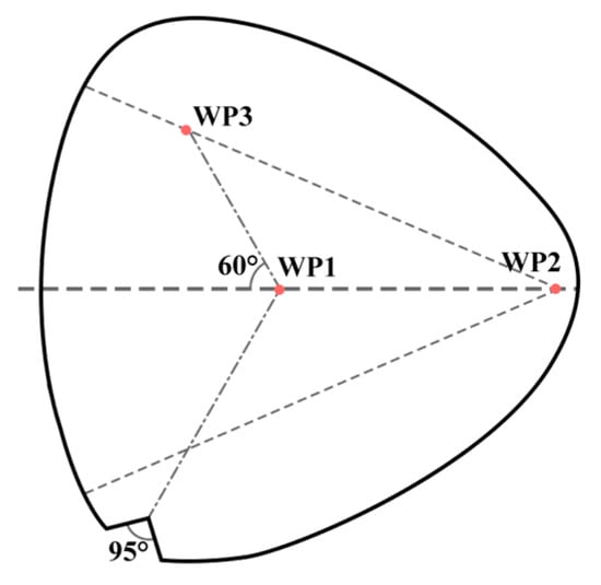 - Take point WP2 as the center and draw a 46.6° arc with a radius of 88,380 mm, and then take WP1 as the center and rotate the circular section 120° clockwise and counterclockwise to form three arcs;