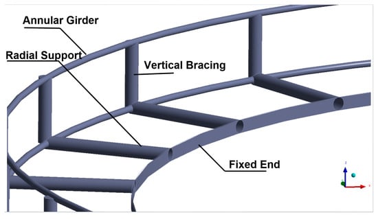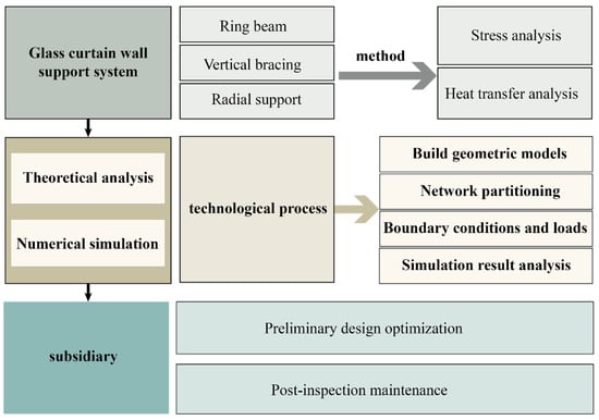 With the rapid development of architectural technology, the design of high-rise buildings has become increasingly complex, placing higher demands on materials and structures. The glass curtain wall support system of the Shanghai Tower is an excellent case study of an exterior enclosure structure, demonstrating how engineering design meets these requirements through innovation (Figure 5). We conducted a detailed study of its structural performance through theoretical derivation and assistance from ANSYS 2021R1 software, aiming to offer guidance and inspiration for the future design of similar structures.