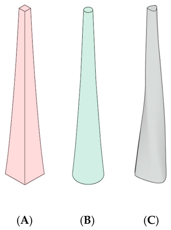 As the Shanghai Tower is unique in shape, it can reduce the wind pressure on the building surface [31]. In this paper, the actual building model of Shanghai Tower is set as Program A, and the cylindrical model of the square cross-section is set as Program B. Program C is a cylindrical model with a circular cross-section. As is shown in Figure 9, the three programs are equal in terms of cross-sectional area at any height. This ensures that the model volumes of the three programs are consistent. Figure 10 shows an axonometric diagram of the three scenario models.