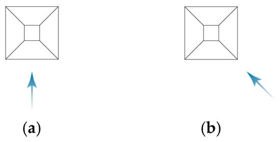 Due to the symmetry of Program A, when considering its ventilation, only the positive wind direction and diagonal wind direction, that is, the southerly and southeasterly wind, need to be considered, as is shown in Figure 11. The arrows in the diagram mean the wind direction.