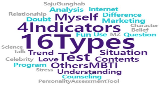 These clusters provide insights into various perceptions: (1) High public interest in understanding what the MBTI is, contemplating the perception indicators forming the MBTI, and concerns about potential overindulgence. (2) The use of the 16 types of MBTI in everyday conversations or specific situations, aiding in understanding or inferring others’ behavior but accompanied by discomfort due to side effects like stigmatization. (3) Active usage of the MBTI by Generation MZ for programs or employment-related information. (4) The MBTI as a representative character that can symbolize an individual enjoyed in connection with celebrities’ MBTI or trends, yet causing stress when excessive interest is shown in relationship situations like gatherings. (5) The MBTI is recognized as a universal and representative cultural phenomenon in South Korea, akin to K-pop, widely used in marketing, and available through various test formats from free Internet tests to official ones. (6) Public awareness of the professional use of the MBTI in South Korea, expressing interest in utilizing personality differences for education or career counseling through experts, as well as showing interest in FormQ (an enhanced version of the MBTI) and Enneagram (a type of personality test tool). Through these results, it was possible to confirm the ‘two sides of the coin (utility and fatigue)’ of the MBTI.