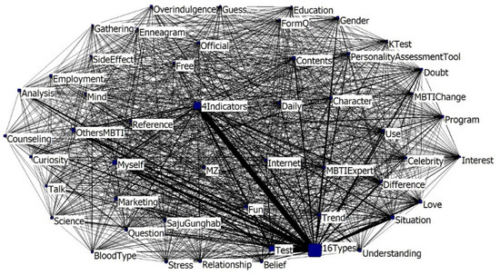 Secondly, the network analysis revealed that the MBTI network has a density of 0.998. Network density reflects the overall degree of connection between keywords within the network, ranging from 0 to 1, with higher values indicating greater network cohesion [59]. With a network density close to 1 in this study, at 0.998, it suggests high cohesion within the MBTI network. This implies that certain keywords influence others or propagate in connection with them. Additionally, the network centralization of 14.3% indicates that the MBTI network lacks concentration on specific keywords, highlighting active exchanges or interactions among keywords expressing various topics. The MBTI network demonstrates not only the public’s reception of MBTI-related information but also its reproduction and dissemination through active engagement. Therefore, it can be said that the MBTI has ‘expandability’ through members of society.