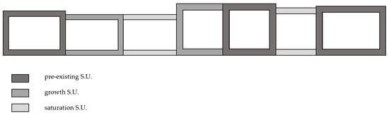 In many European countries, historic urban areas are generally characterized by unreinforced masonry (URM) buildings commonly clustered in aggregated configurations [,,,,]. These buildings, due to their construction and evolution history, were not built in a unique phase but they were gradually ‘assembled’ over time through a process of merging, expanding, and modifying the original structures. As a result, within a building aggregate, it is possible to delineate sections of buildings characterized by top-to-bottom structural continuity. These sections, termed structural units (S.U.s) [,], typically arise from a unified construction process or the presence of homogeneous vertical and horizontal elements, which facilitate a uniform distribution of loads. They can be classified into three main categories on the basis of their construction genesis: pre-existing, growth, and saturation S.U.s (see Figure 1). The pre-existing units are those that were originally built as individual buildings before being incorporated into the aggregate; the growth units are those that were added to the pre-existing units; the saturation units are those that fill the gaps between pre-existing and/or growth units.