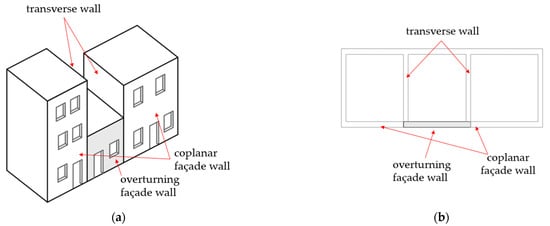 In the second and third cases, the façade wall can be susceptible to global or partial overturning mechanisms, provided that there are no devices, such as curbs and chains, that prevent the wall’s overturning mechanisms. In particular, in the second case, the façade wall is not affected by any interactions with the adjacent buildings and can be considered in an isolated configuration; in the third case, it is assumed that the wall is affected by the interactions with the adjacent buildings to which it is connected, which are referred to as the aggregate effect.