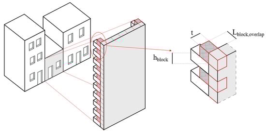 Based on the above considerations, this study models the aggregate effect by considering the frictional forces acting at the connections between the overturning façade wall and the transverse walls, shared with the adjacent units, and/or the coplanar façade walls of the adjacent units [,]. It is assumed that the overturning façade wall is interconnected with the transverse adjacent walls through parallelepiped interconnecting blocks, such as those illustrated in Figure 3. Although URM can be made up of irregularly shaped blocks, the simplification of considering regular parallelepiped interconnecting blocks enables the simulation of frictional contact between facade wall blocks embedded in adjacent walls. This representation effectively captures the global aggregate effect without introducing overly complex shapes that would affect the computation effort of the approach.