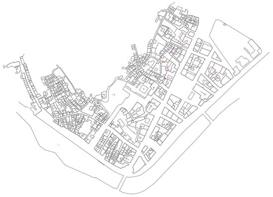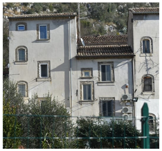 In recent years, numerous studies have addressed the seismic vulnerability of aggregate buildings in historic urban areas [,,,,,,,,,]. Some of them propose approaches at various scales, such as single aggregate buildings or on a territorial scale [,]. For example, in [], the historic center of Campotosto (central Italy) is analyzed on an urban scale by using an empirical method based on data relevant to the post-2009 L’Aquila earthquake, as well as being analyzed on a building aggregate scale by applying an analytical method implemented in the Vulnus software []. Similarly, in [], the historical center of Castelpoto (southern Italy) is analyzed on an urban scale by applying the vulnerability index method [] and taking into account the interactions between adjacent structures, as proposed in [,], as well as being analyzed at the building aggregate scale by means of the 3Muri software [].