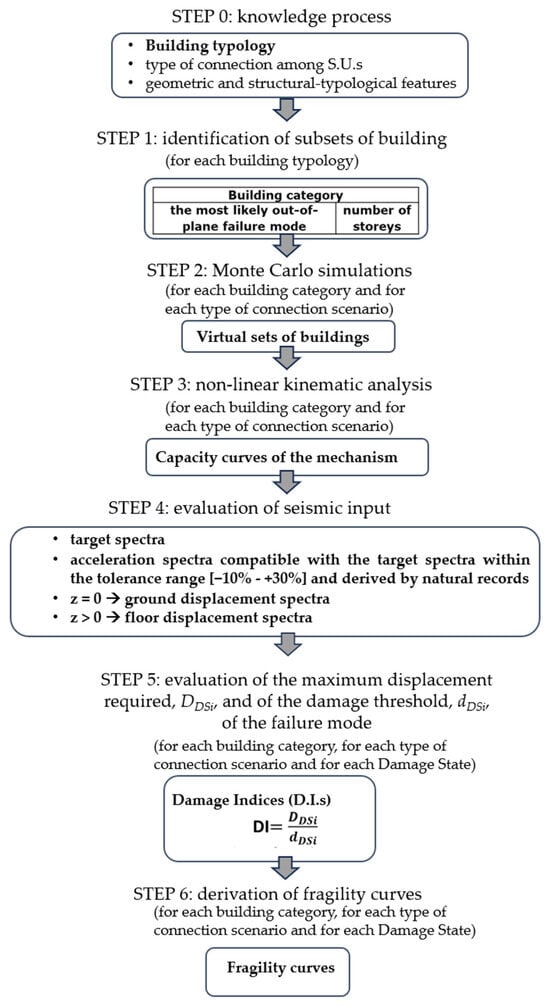 The approach operates in seven steps. It begins with defining the prevalent building typologies in the urban area, considering factors such as construction age, construction technique, and structural features. It then identifies how adjacent buildings are connected to each other at the intersection between the facade wall and the adjacent walls (Step 0). Then, for each building typology, it categorizes buildings with the same most probable out-of-plane failure mode (e.g., global simple overturning) and the same number of floors. This categorization creates subsets of buildings for each building typology, known as building categories (Step 1).