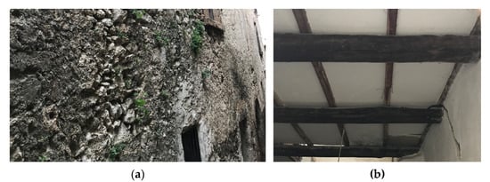 (a) Masonry typology characterizing the building typology “BT 1”; (b) slab in wood for a building belonging to the building typology “BT 1”.