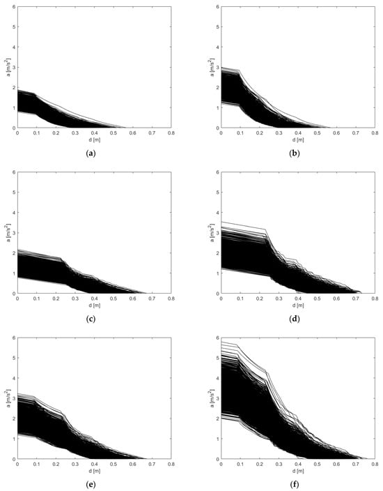 - The mean values obtained through a linear regression of the natural logarithm of the DIs versus the natural logarithm of the PGA [];