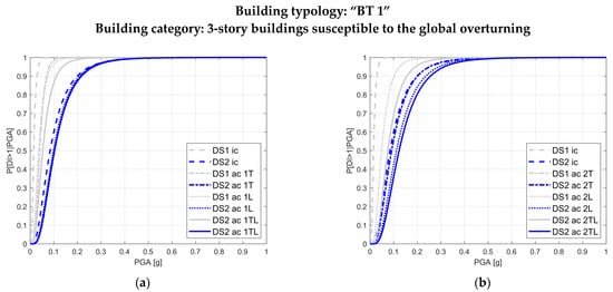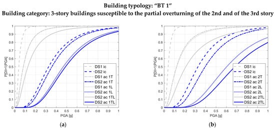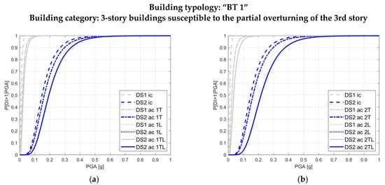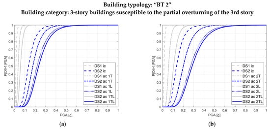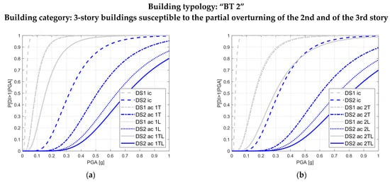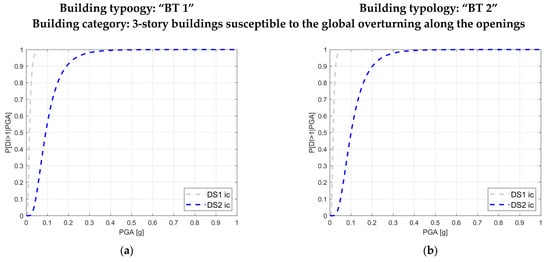These results demonstrate that the influence of the aggregate effect depends on both the connection scenario and the building typologies. In particular, the aggregate effect is limited for buildings of “BT 1” but is relevant for buildings of “BT 2”. The limited influence of the aggregate configuration for buildings of the “BT 1” typology results from the presence, in such buildings, of small interconnecting blocks on the upper floors. These blocks rapidly lose contact with each other as the tilting progresses, and the beneficial effect of the friction quickly disappears. In contrast, buildings of the “BT 2” typology have larger interconnecting blocks on the upper floors. These larger blocks maintain contact with the adjacent walls longer during overturning, resulting in a significant reduction in vulnerability for the “BT 2” typology in aggregate configurations compared to that in isolated ones. Further, it is also evident how the lateral connection is more effective than the transverse one in reducing the seismic vulnerability. Indeed, the capacity curves of Figure 15 show that sliding between blocks starts at higher levels of PGA, due to the fact that the contact surface between blocks is larger than in the case of transverse connection.