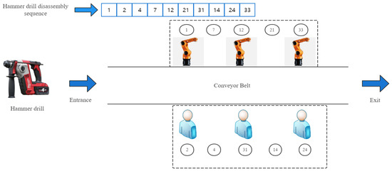 This paper investigates the two-sided disassembly line balancing problem, taking into account the categorization of parts into fine and hazardous classifications. Specifically, fine parts are designated for human disassembly, while hazardous parts are reserved for robot disassembly. With the increasing prevalence of intelligent factories, there is a growing trend toward leveraging robots for certain tasks to enhance efficiency, achieve better yields, and reduce disassembly times. Consequently, this paper addresses the challenge of human–robot collaboration. Figure 2 illustrates a strategically designed layout for disassembly sequences based on the types of disassembly lines discussed in this paper. This layout ensures compliance with priority relationships and effectively manages conflicting relationships within the disassembly process.