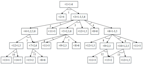 As shown in Figure 3, the parentheses in the small box represent the subassembly number, and the example is from subassemblies 1–15, i.e., 15 subassemblies. The number after the parentheses represents the part numbers of the subassembly, e.g., subassembly 5 contains parts with serial numbers 2, 3, and 6. With arrows and brackets representing tasks, the example task’s serial numbers range from 1 to 13, encompassing a total of 13 tasks.