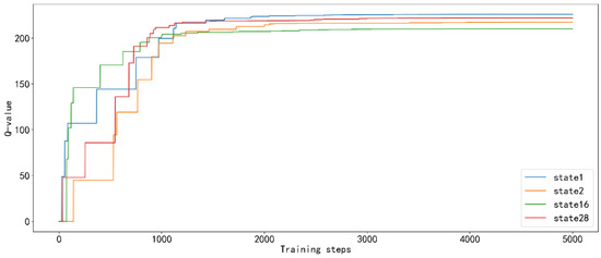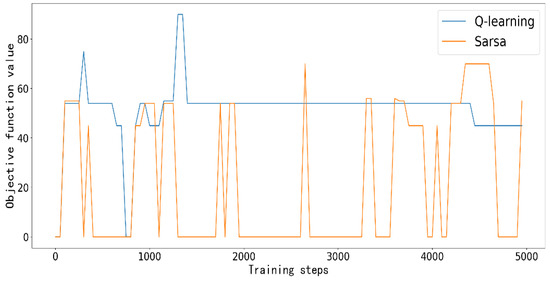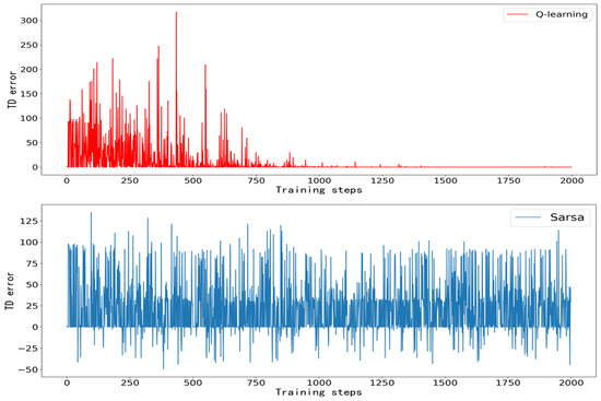Figure 8 shows the convergence of TD error for the Q-learning and Sarsa algorithms. It can be observed that the Q-learning algorithm reaches convergence after approximately 1250 training steps, whereas Sarsa remains unstable even after 2000 steps.