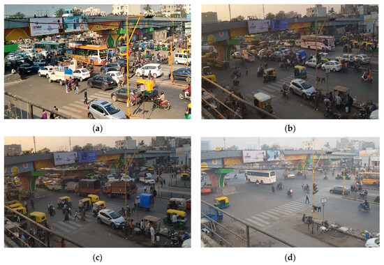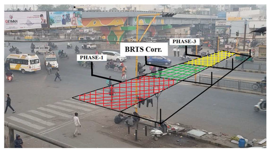 Classified vehicular volume data were gathered at every 5 min interval throughout the six hours (06:31–06:35, 06:36–06:40, 06:41–06:45, and so on); the density data were derived from vehicle class counts by pausing the video at every 30 s interval for a total 6 h. Regardless of how they crossed the road, pedestrian movements were documented concurrently with vehicular observations. The primary site for data collection is shown in