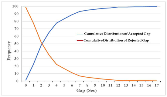The methodology involved categorising the data into multiple ranges, from 0–1 and 1.01–2 to 2.01–3, and so forth, up to the maximum accepted gap value. A table tabulating the number of gaps falling within each range was generated. Cumulative values for gap classes were calculated, and corresponding columns noted that the count of gaps did not fall within those ranges. A graph was plotted to depict the relationship between accepted gaps within each class and the count of non-accepted gaps within the same class. In this instance, the critical gap was identified as the value where both curves intersected, determined to be 2.05 s. The graph is shown in
