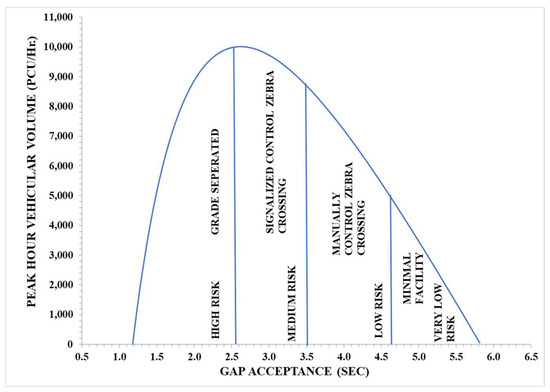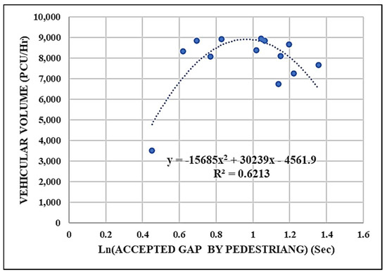 Figure 7. The volume of vehicles increases in tandem with a corresponding increase in gap size. However, this trend reaches a limit, typically when vehicular volume peaks. At this point, pedestrians tend to accept significantly larger gaps, creating a steep incline in the graph. Beyond this peak, the pedestrian acceptance of gaps increases as vehicular volume declines moderately.