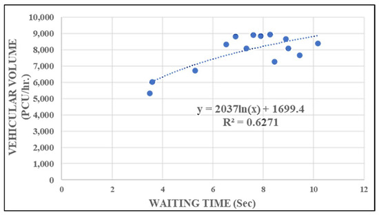 A similar methodology explored the relationship between vehicular volume and waiting time. Identical datasets were chosen for this analysis. A logarithmic relationship between both parameters was selected due to practical conditions; this implies that as vehicular volume increases, delay also consistently escalates. The resulting graph is presented below.